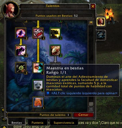 Sin entretenerme demasiado con los nuevos talentos en las tres ramas del cazador, los Maestros de Bestias (me centro en la mía, que quien mucho abarca…) con el punto 51 de la rama, tendrán la habilidad de domar bestias “exóticas” (véase el Devilsaurio de Un’Goro o algunos de los repelentes bichos de Silithus, por ejemplo).